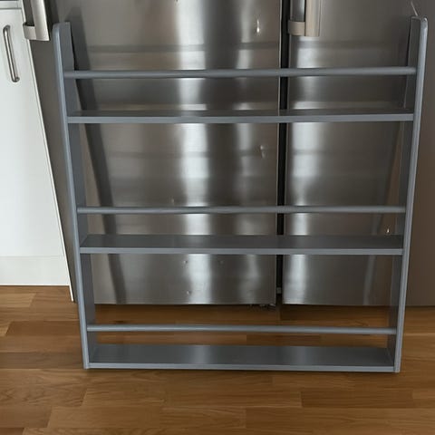 Gammal och ommålad tryckerilåda. Har använts som en hylla på väggen.