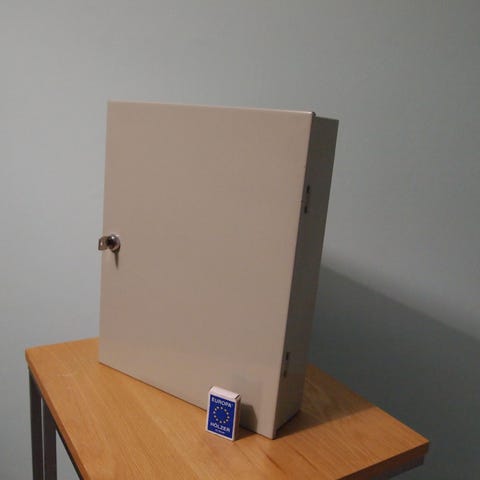 Metallskåp med två hyllplan och lås. Skåpet är tillverkat i metall,