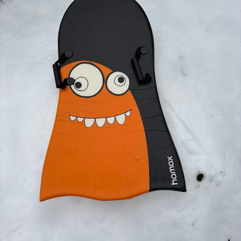 Snöbräda Pirat med färgglad design. Passar för vintersportaktiviteter i snö. Några revor under men fungerar som den ska. Längd 107 cm bredd 50 cm.