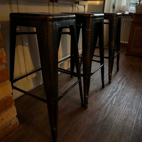 Säljer en stabil hög stol med fotstöd. Träsits/rygg och metallstomme - perfekt till köksö, barbord eller som café-/retro-stol.