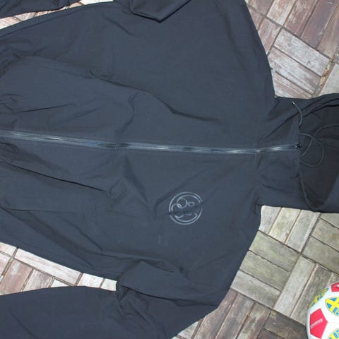Yeezy jacka i storlek XL för herr, tillverkad i svart läder. Jackan har en huva och är avsedd för utomhusbruk.