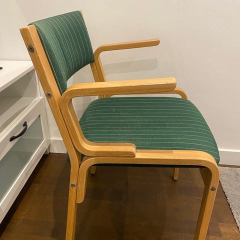 Stadig och bekväm med armstöd och stoppad sits i neutralt tyg. Passar fint som köksstol, skrivbordsstol eller accentstol i hall eller sovrum.