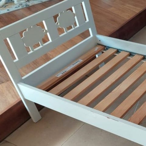 IKEA barnsäng i vitt trä. Sängen har en ram formad som ett hus och är anpassad för barn. Den är tillverkad av trä och har en enkel design med ribbotten. Sängen är lämplig för barnrum och erbjuder en stabil sovplats.