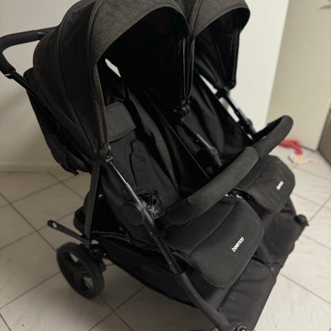 Beemoo syskonvagn dubbelvagn i grå färg. Vagnen är utformad för två barn och har säkerhetsbälten för varje sittplats. Passar för barn i olika åldrar och är lämplig för promenader och vardagligt bruk.