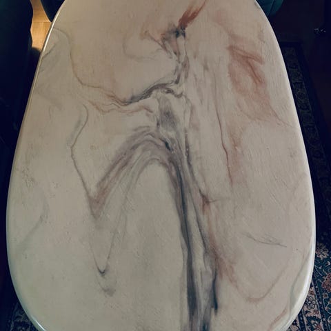 Round side table with lots of snall damages. I have put on a table cloth so its not noticble.
