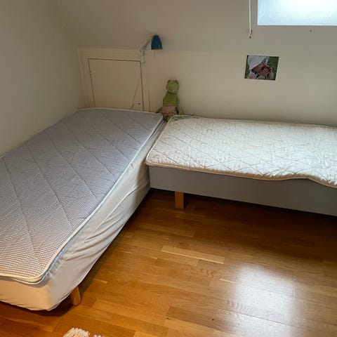 En helt okej dubbelsäng bortskänkes på grund av flytt. Det är 2 st 80 cm sängar som antingen kan sitta ihop eller så kan man använda var för sig. Bäddmadrassen är dock 160 cm och till för när sängarna sitter ihop.