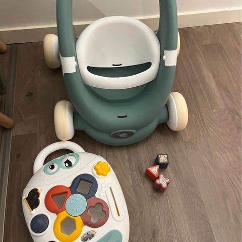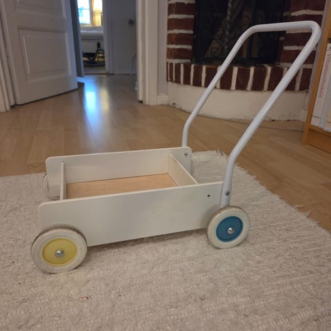 Säljer nu en mycket fin och klassisk lära-gå-vagn från märket Micki. Hjulen har fyra olika färger. Handtaget kan ställas i två lägen för att passa barn i olika stadier.