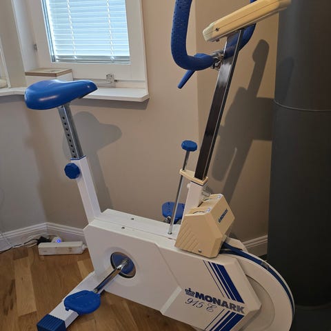 Domyos 500 06 motionscykel från Decathlon, designad för både nybörjare och mer erfarna användare, känd för sin stabilitet, mjuka sadel och bekväma design med justerbar höjd och djup för sätet, samt justerbart styre.
