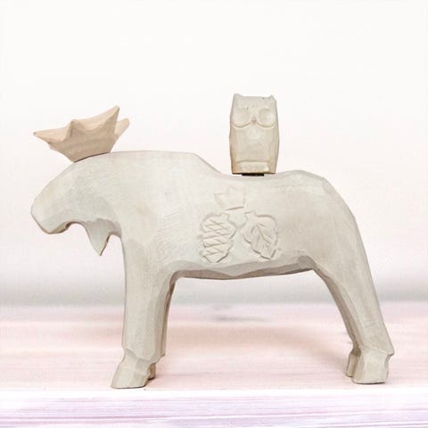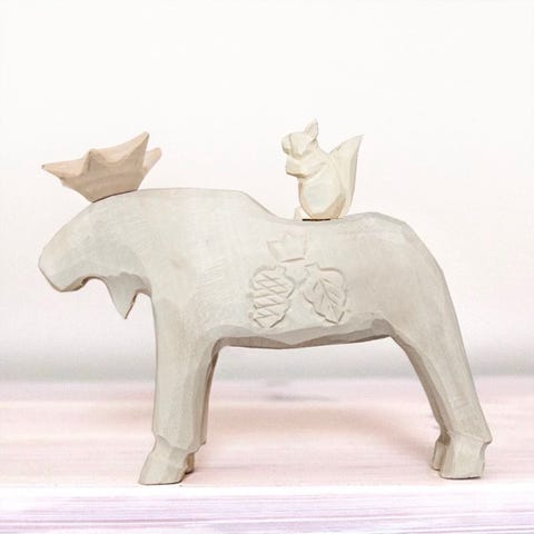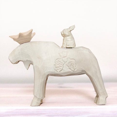 Handgjord träälg med tillhörande fågel, inspirerad av nordisk natur och svensk hantverkstradition. Varje älg är varsamt tillverkad för hand, vilket gör varje exemplar unikt med små variationer som ger liv och karaktär.