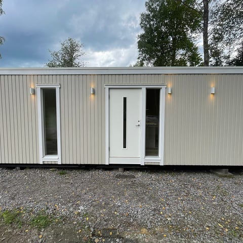 Nybyggt attefallshus där köparen själv får komplettera väggar, loft och badrummet för egen prägel med färgval.