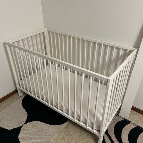 IKEA Spjälsäng för barn. Enkel design med vita trästavar. Passar som barnsäng för spädbarn och småbarn.