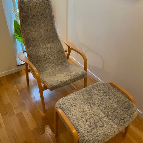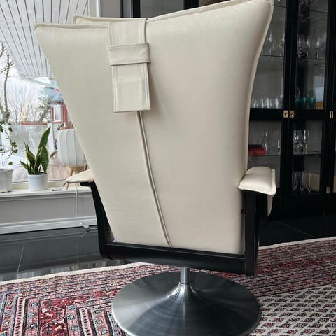 Nypris för fåtölj inklusive pall är cirka 30000 kr. Denna fåtölj har några år på nacken men är fin och välhållen. Pallen har en väl synlig nötning, därav priset 5500 kr.