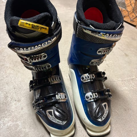 Salomon skidpjäxor i blå färg med storlek 28.5 (UK 10, US 10.5). Skidpjäxorna har fyra spännen för justering och är avsedda för skidåkning.