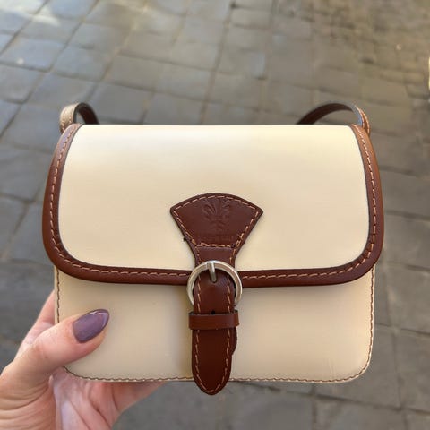väska i läder för kvinna. Väskan är vit och har en kedjerem. Den har en quiltad design och en dekorativ metalldetalj på framsidan. Insidan har ett fack med dragkedja.