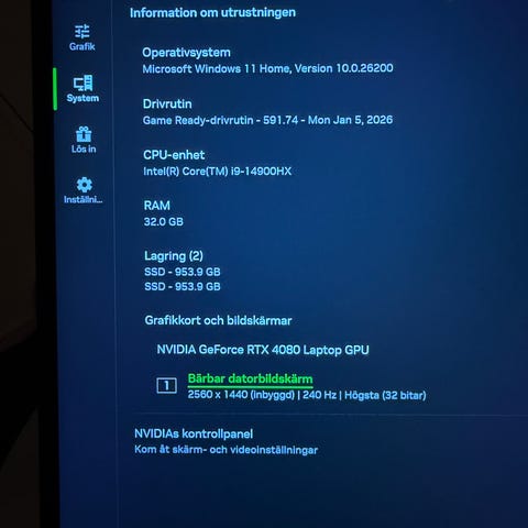 Den har uppdaterats med 32gb ddr4 3200mz minne samt 2,5Tb hårdiskutrymme.