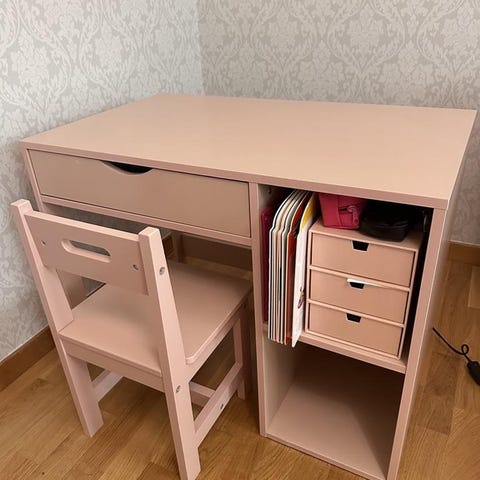 IKEA barnmöbel skrivbord med förvaringsutrymme i vitt och rött. Möbeln har en skrivbordsytan och flera fack för organisering och förvaring.