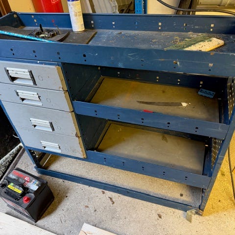 Verktygsskåp med flera lådor och öppna förvaringsfack i olika storlekar. Skåpet är tillverkat i metall och har en grå och grön färg. Utrustat med små plastbackar för sortering av mindre delar. Passar till Volskwagen transporter, caddy samt andra skåp bilar. Skåpen säljs separat. Priset kan diskuteras, kom med förslag