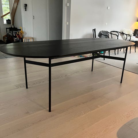 Jättefint måttbeställt matsalsbord i svartbetsat massivt trä. Praktisk vit laminatyta ovanpå som är väldigt tålig. Förlängningsbart.