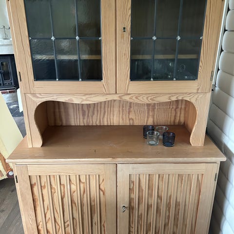 Furu vitrinskåp med potential, kan bli vackert vitt eller kanske dov salviagrön.