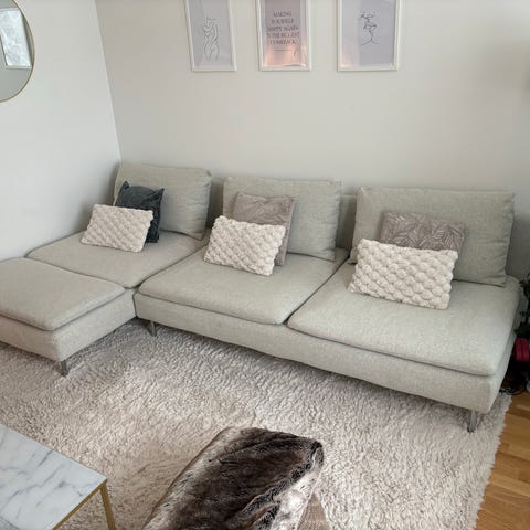 IKEA hörnsoffa i beige tyg (Gunnared beige). Modellen heter Söderhamn och säljs på ikea för drygt 12000:-. Soffan har en modern design med lösa rygg- och sittkuddar. Passar för vardagsrum och erbjuder plats för flera personer. Tygmaterialet är lätt att underhålla samt går att tvätta i maskin och soffan har en neutral färg som kan anpassas till olika inredningsstilar. Inköpt 2022 men lägenheten där den stått har stått tom i drygt 2 år, och soffan är i väldigt fint skick.