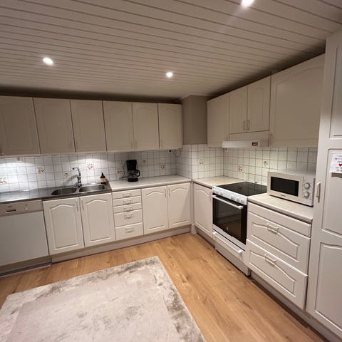 Kök med vitvaror och förvaringsskåp i vitt och grönt