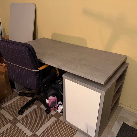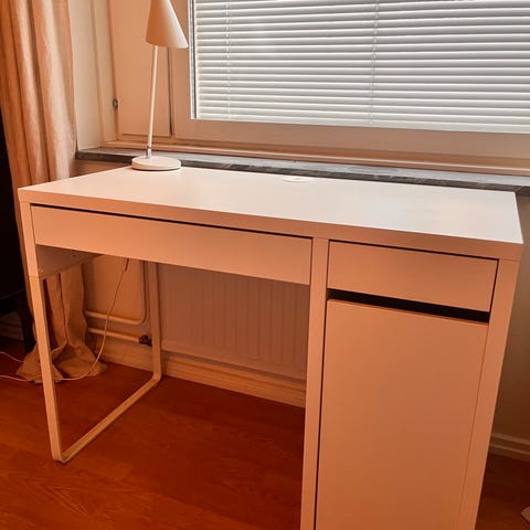Svart massivt skrivbord med fastmonterade eluttag. Perfekt när man har flera skärmar, och andra elektrisk utrustning. Fint skick. Går förstås att skruva bort om man vill det.