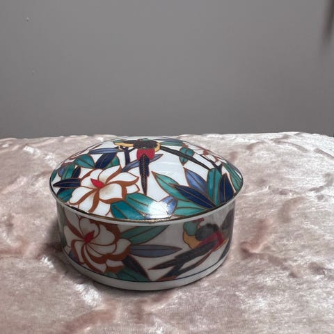 En mycket exklusiv, vacker och dekorativ porslinsask i japansk porslin, Takahashi Tropicale Porcelain Trinket Box. Den är tillverkad i Japan.
