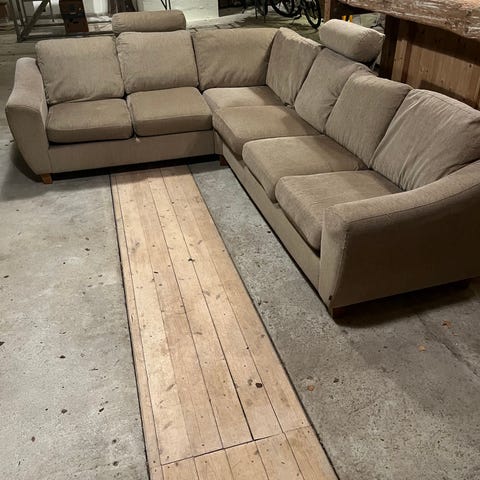 Hörnsoffa i beige tyg med flera sittmoduler och breda sittdynor. Soffan har hög rygg med lösa ryggkuddar och djup sits som ger gott om plats. Passar i vardagsrum eller större sällskapsytor där man vill ha många sittplatser.