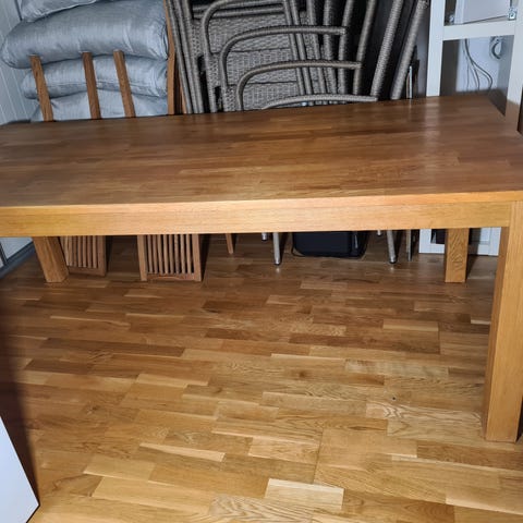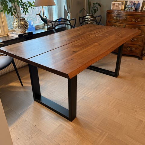 Ekbord med mörkgrå ben. Mått: 140x90 cm höjd 75 cm. Bordsskivan behöver oljas in.