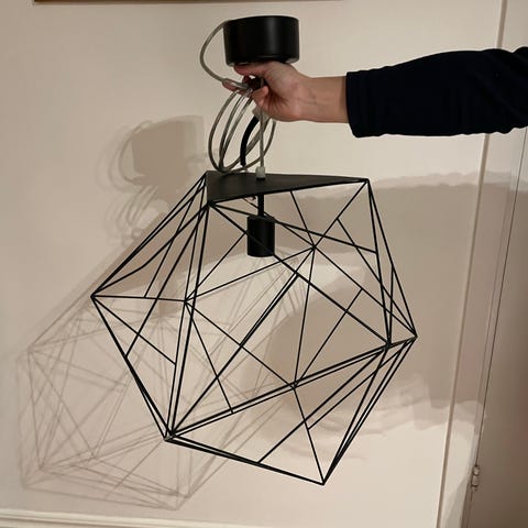 Dekorativ taklampa med skärm av lindad ståltråd. Ger ett mjukt och stämningsfullt ljus. Passar över matbord, i sovrum eller vardagsrum.