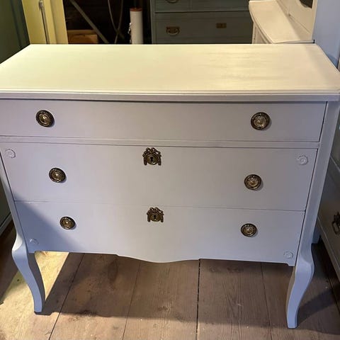 Lådan längst ner saknar del av mässingshandtag på höger sida.