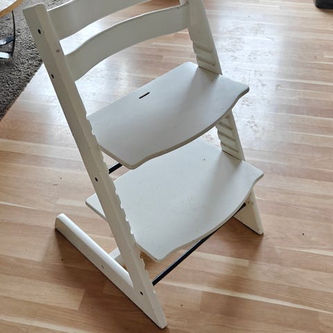 2st vita tripptrapp-stolar perfekta för syskon- eller tvillingpar. Synbara skrapmärken finns på båda men i övrigt fräscha och stabila. 800kr styck eller 1500kr för båda.