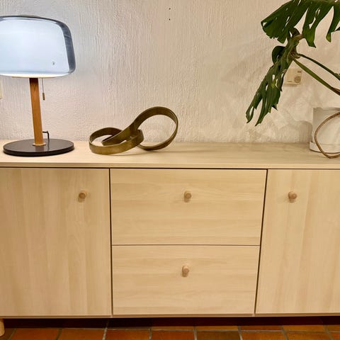 En skänk i ek med 3 st glasdörrar nedtill och en låda över varje glasdörr.