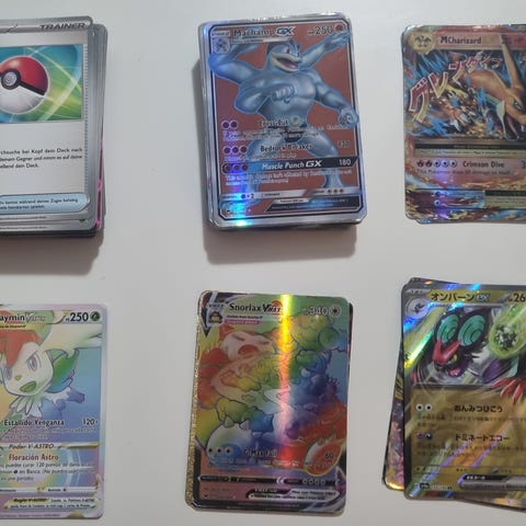 Pokémon GX samlarkort med karaktärerna Steelix, Zoroark, Silvally, Zygarde och Darkrai. Varje kort visar olika attacker och förmågor med holografisk design.