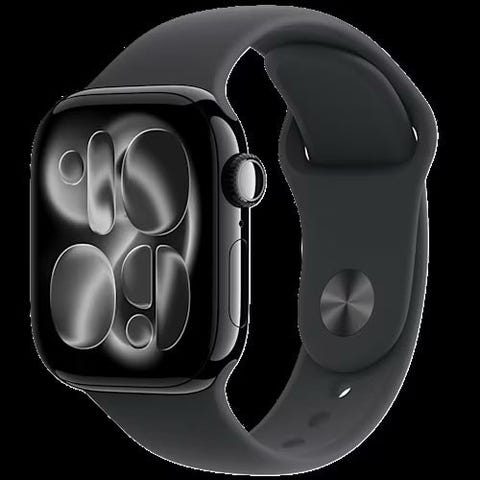 Apple Watch svart smartklocka med rektangulär skärm och svart armband. Passar för daglig användning och har funktioner för hälsa och kommunikation.
