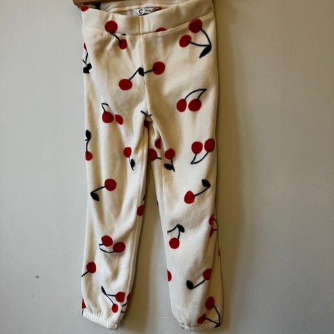 Ett par mycket fina marinblå mjukisbyxor med fina körsbärs detaljer gjorda med paljetter.