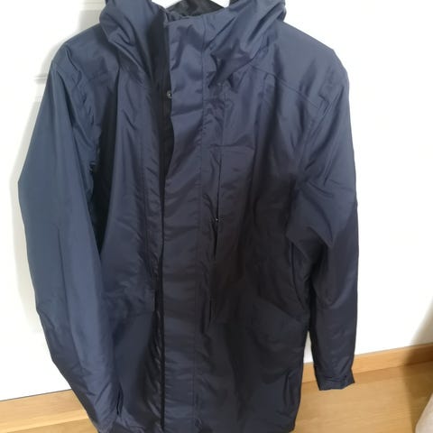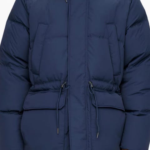 Vadderad parkas av ett nylontyg med krispig känsla och vattenavvisande egenskaper. En modell med huva och knappslå fram med tryckknappar och tvåvägsdragkedja. Snedställda stolpfickor och två stora utanpåfickor med lock och knäppning. Dragsko i huvan och i midjan. Ribbade muddar och justerbara flikar med tryckknappar vid ärmsluten. Innerficka med dragkedja. Lös passform.