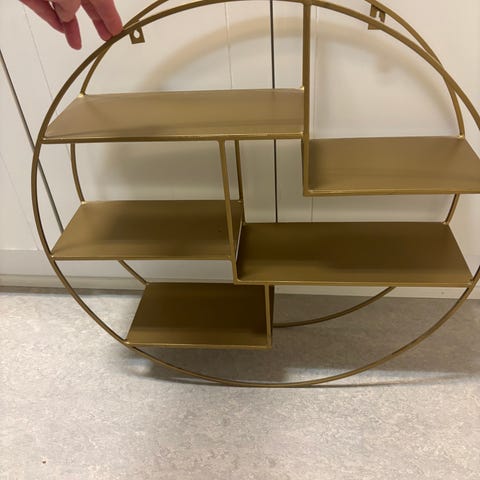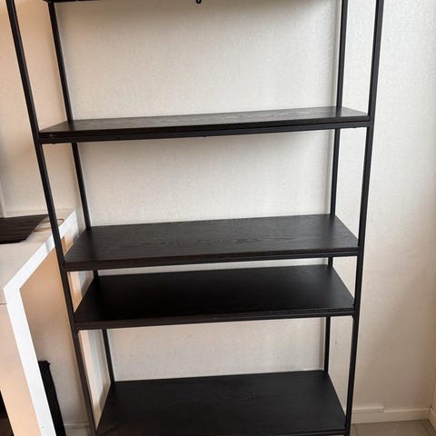 Golvhylla i lackerad metall med hyllplan i betsat askfaner.