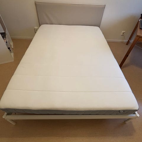 IKEA säng med sänggavel och förvaringsutrymme under sängen. Sängen har en mörkgrå färg och metallben.