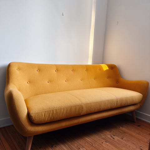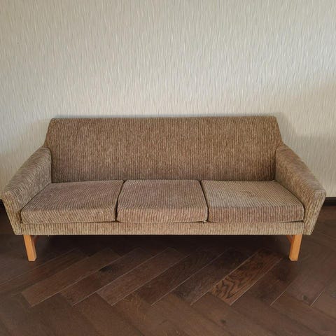 Liten och nätt soffa klädd i gråbeige ullklädsel med ben av ek.