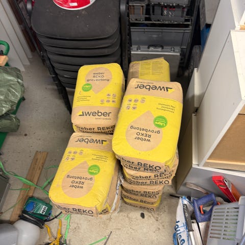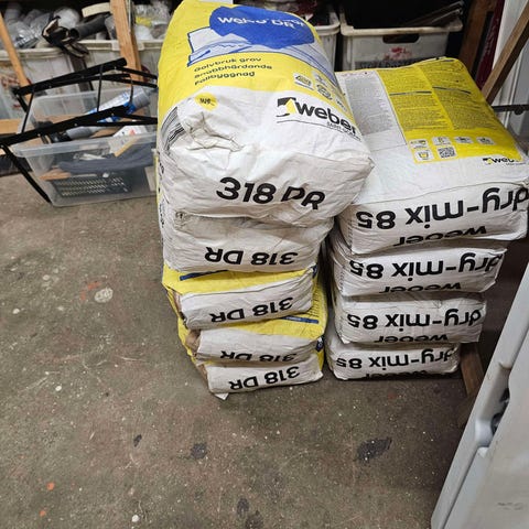 Betongsäckar på 25 kg vardera. Tror det är 8 grov och 6 fin. Två papprör ingår.