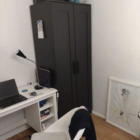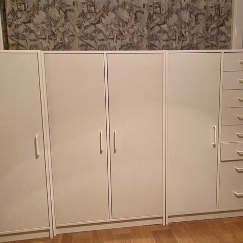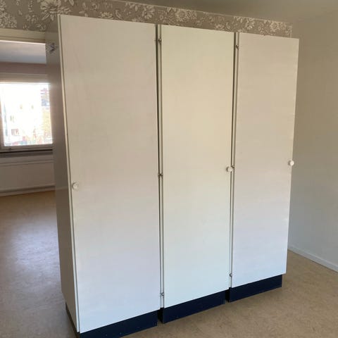 Bortskänkes! Tre garderober. Fint skick. Två har dörrar en är utan dörr. Alla med hyllplan. Vi bor 4 tr utan hiss. Man behöver vara två som bär :)