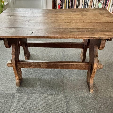 Skivan har inte varit monterad. Saknar därav skruvhål och behöver monteras. Underredet i metall med spända rep i vitt är använt.