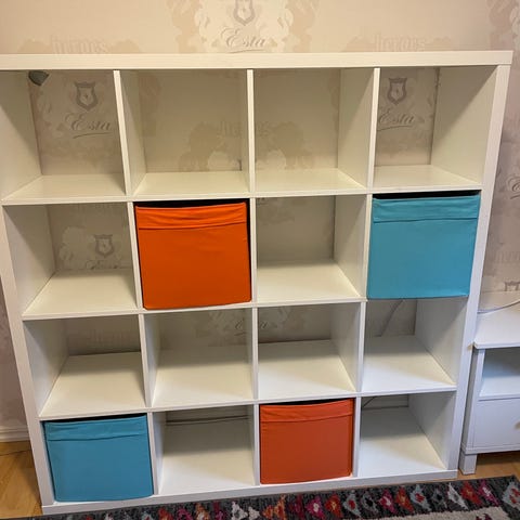 IKEA Kallax förvaringsmöbel svart med lådor blå och vita