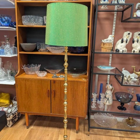 Unik golvlampa i mässing med väldigt fint mönster. Funkar utmärkt.