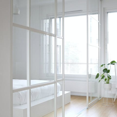 Detta är en flexibel lösning utan stomme där skenor monteras i tak och golv, vilket gör att bredden kan anpassas något efter behov.