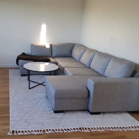 Mio Soffa Hörnsoffa i grått tyg, ca 2 år. Soffa med divan ger extra sittplats och komfort. Tvättbart tyg i dynorna. Hund (husky) finns i hemmet vilket syns på baksidan av dynorna som har annan textil. Priset går att diskutera. Divanen har längd. 1.80