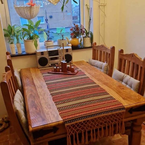 Matgrupp från MIO, diameter på bordet är 110cm. Inklusive fyra sammet matstolar. Bordet i bra skick