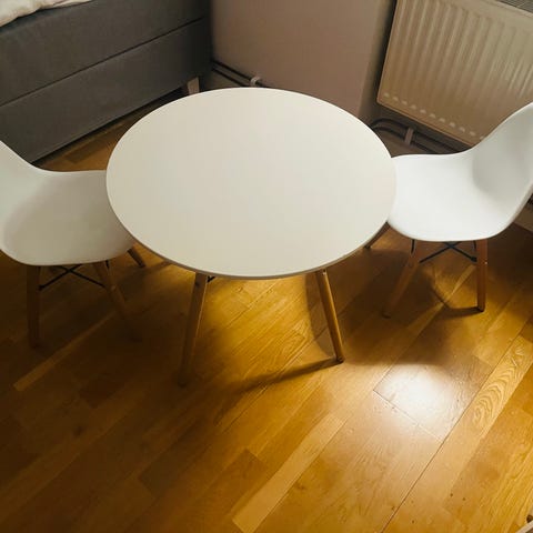 Bordet har lite pyssel skavanker på bordsytan, vilket syns på bilden. Det behöver lite kärlek, kanske en lätt uppfräschning eller bara en ny ägare som uppskattar dess charm. Stolarna är i gott skick.
