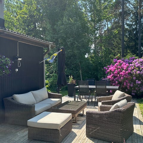 4 Blåvit-randiga dynor medföljer om man vill.